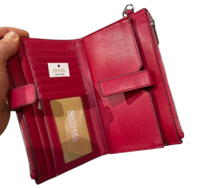 Michael Kors Jet Set Large Women Logo Double Zip Wristlet Wallet Dark Raspberry